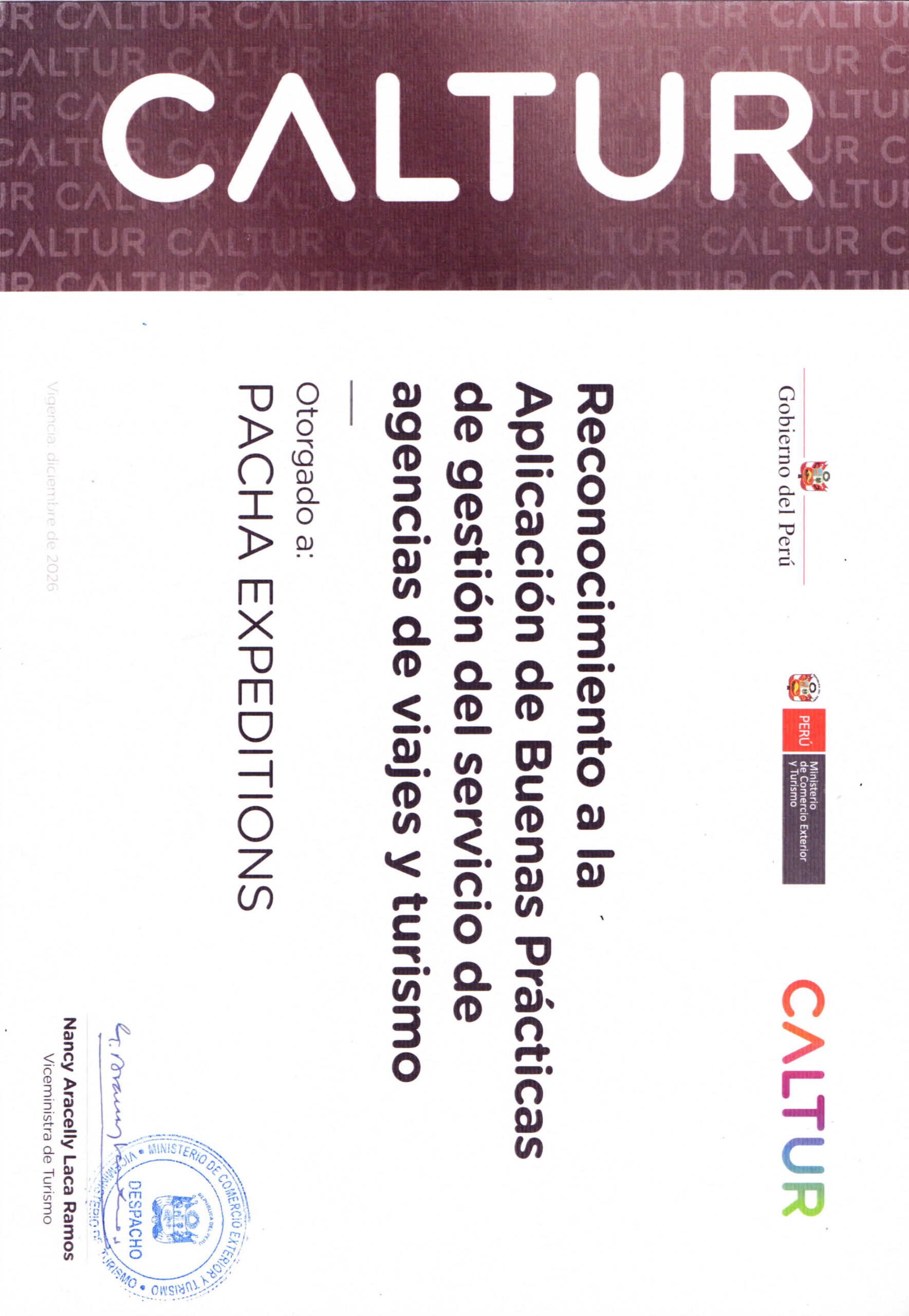 - CALTUR (National Tourism Quality Plan): Pacha Expeditions has renewed its Gold Level Tourism Quality Seal for 2025. This is the highest recognition granted. By Peru Ministry of Foreign Trade and Tourism (MINCETUR). For excellence in management, sustainability, and customer service.