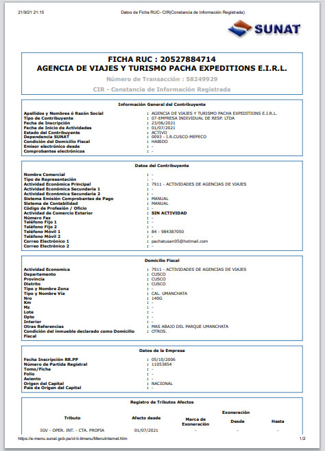 - SUNAT Registration: The company is legally. Registered under the business name. Agencia de Viajes y Turismo Pacha Expeditions E.I.R.L. with the RUC (tax ID) number 20527884714.